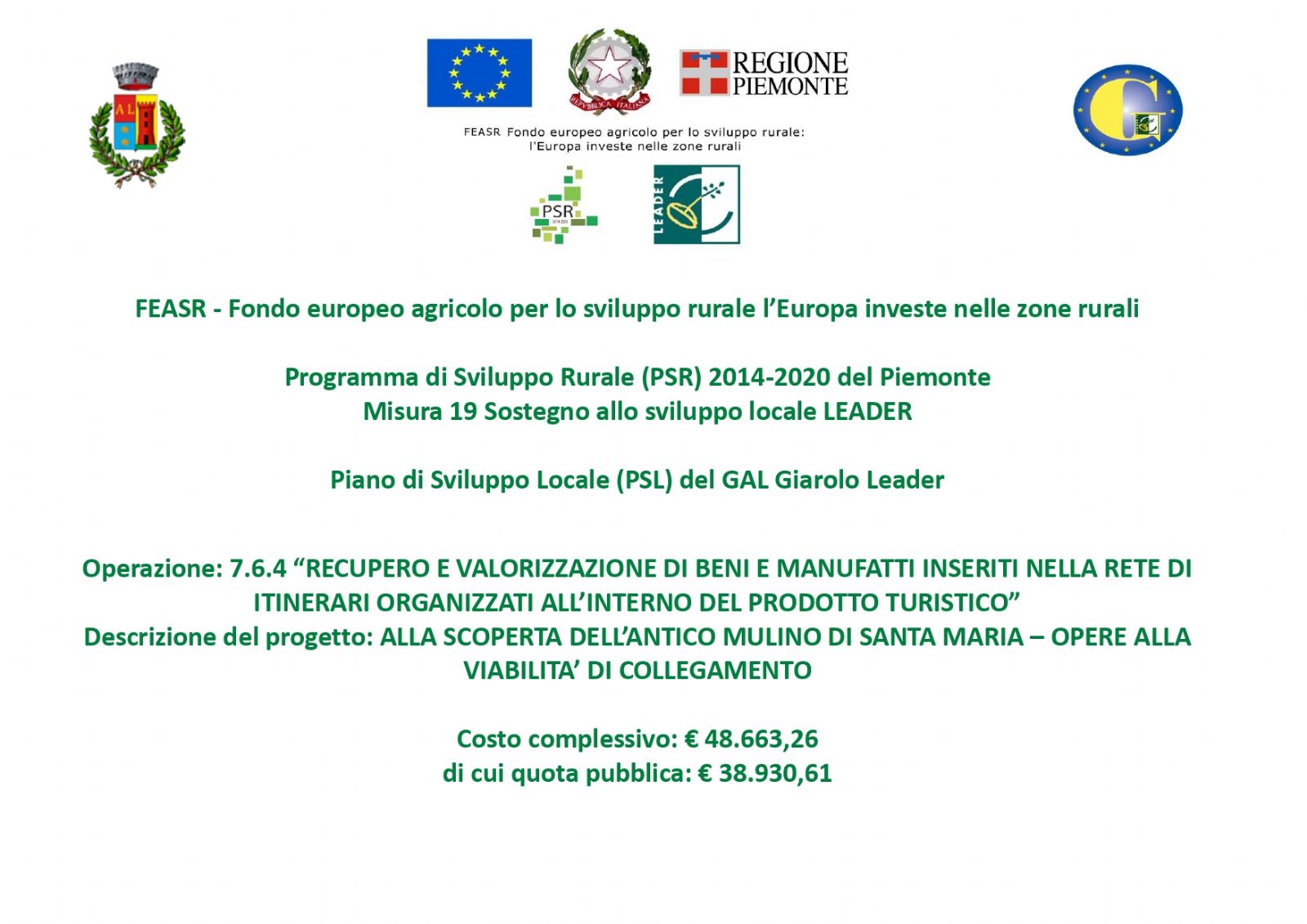 Descrizione del progetto: ALLA SCOPERTA DELL’ANTICO MULINO DI SANTA MARIA OPERE ALLA VIABILITA’ DI COLLEGAMENTO
