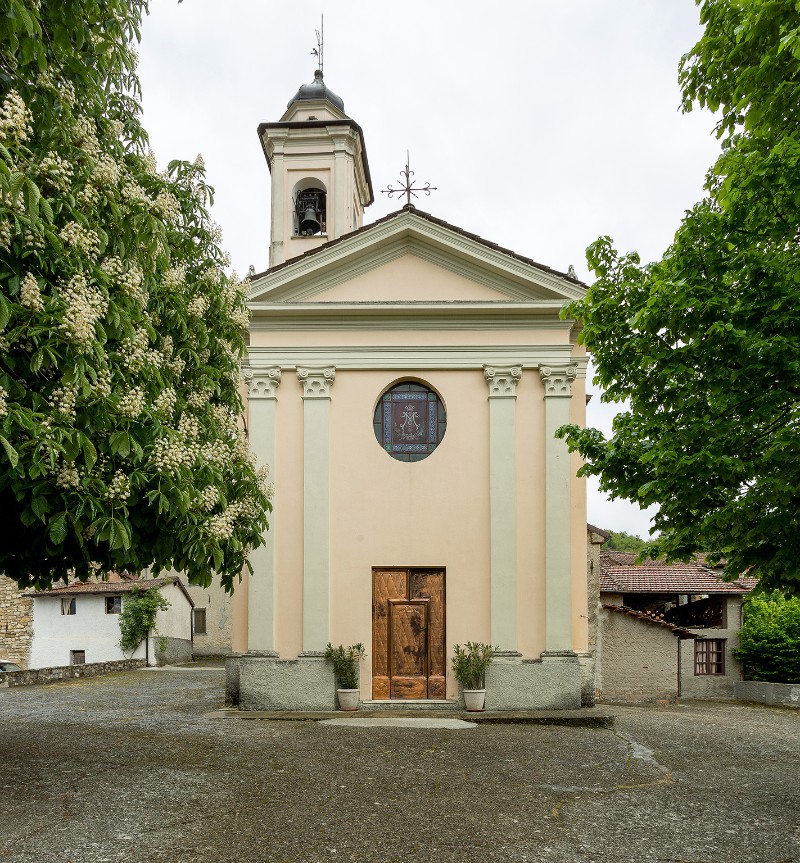 La parrocchia di Figino si trova nel centro della frazione, con il fronte rivolto alla valle. La facciata a capanna, intonacata, è suddivisa verticalmente in tre campi da paraste, dotate di basamento e capitello composito, che sorreggono la trabeazione del timpano di coronamento. Il campo centrale, ospita il portone di accesso; al di sopra dello stesso è presente un oculo. La Chiesa presenta schema planimetrico a navata unica, con zona absidale a sviluppo curvilineo in pietra a vista. La navata presenta volta a botte, con lunette. Il fonte battesimale, in marmo, è posto sul lato sinistro, protetto da un cancelletto. L'area presbiteriale è rialzata rispetto al piano dell'aula. Il campanile presenta sezione quadrata e si sviluppa sul fianco sinistro dell'edificio, a fianco dell'abside. Il fusto è ripartito in quattro tratte da lesene appena accennate; la cella campanaria è aperta da monofore su ogni lato e protetta da un cornicione aggettante. E' sormontato da un lanternino con copertura a bulbo.